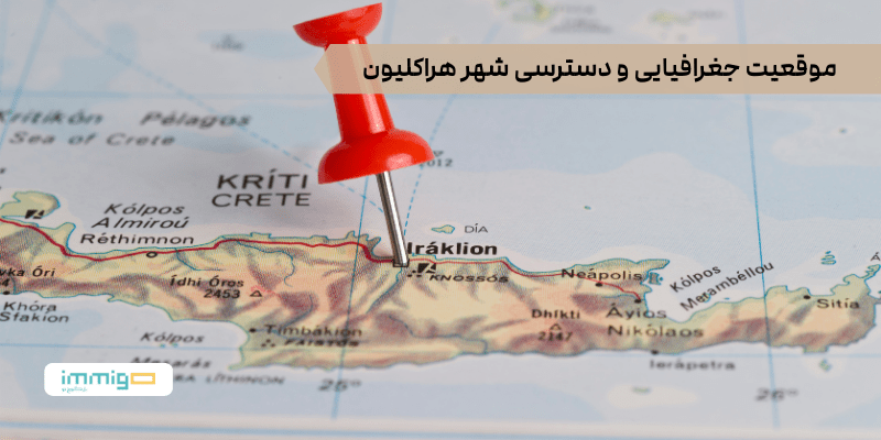 هراکلیون در کرانه شمالی جزیره کرت و در ساحل دریای اژه واقع شده است، موقعیتی که آن را به یکی از نقاط استراتژیک در ارتباطات دریایی و هوایی یونان تبدیل کرده است. فرودگاه بینالمللی هراکلیون و بندر بزرگ شهر، دسترسی آسان به سایر نقاط یونان و اروپا را فراهم میکند. شبکه حملونقل شهری شامل اتوبوسها و تاکسیها نیز گردشگران و ساکنان را به راحتی به مناطق مختلف شهر و اطراف آن متصل میکند.