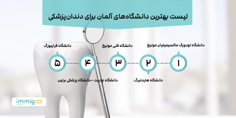 | دانشگاه لودویگ ماکسیمیلیان مونیخ | ۱ | برنامه کامل دندانپزشکی، امکانات پیشرفته کلینیکی و تحقیقاتی، شهرت علمی بسیار بالا |